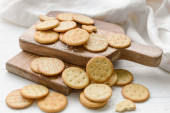 Deska ze smacznymi krakersami na jasnym drewnianym tle