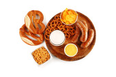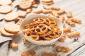 Miski ze smacznymi różnymi krakersami na białym tle