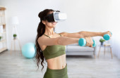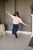 Młoda kobieta w okularach wirtualnej rzeczywistości tańczy w domu