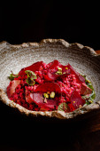 Talerz ze smacznym risotto buraczanym na ciemnym tle