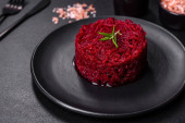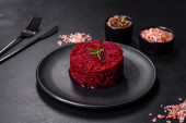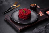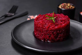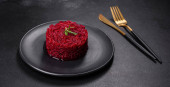Talerz ze smacznym risotto buraczanym na ciemnym tle