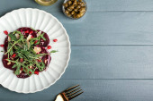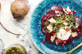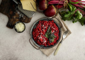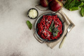 Płyta ze smacznym risotto buraczanym na grunge tle