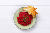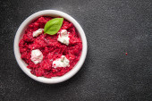 Płyta ze smacznym risotto buraczanym na drewnianym tle
