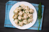 Pierogi mięsne - pierogi rosyjskie, pierogi z mięsem na talerzu na czarnym tle