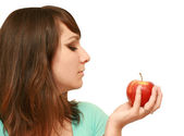 szczęśliwy nastolatek jeść zdrowe firmy apple na śniadanie