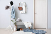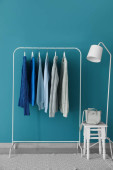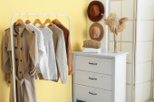 Zdjęcie "Stojak z nowoczesnymi ubraniami we wnętrzu pokoju" może być wykorzystywane do celów osobistych i komercyjnych zgodnie z warunkami zakupionej licencji Royalty-free. Obraz jest dostępny do pobrania w jakości wysokiej rozdzielczości do 5760x3840.