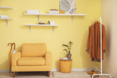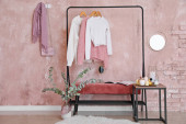 Stojak z nowoczesnymi ubraniami we wnętrzu pokoju