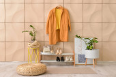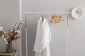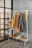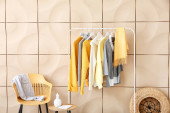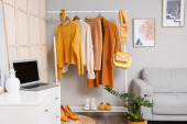 Stojak z nowoczesnymi ubraniami we wnętrzu pokoju