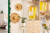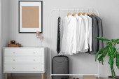 Zdjęcie "Stojak z nowoczesnymi ubraniami we wnętrzu pokoju" może być wykorzystywane do celów osobistych i komercyjnych zgodnie z warunkami zakupionej licencji Royalty-free. Obraz jest dostępny do pobrania w jakości wysokiej rozdzielczości do 5760x3840.