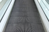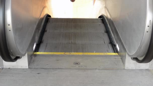 Nowoczesne luksusowe schody ruchome. wideo ruchome kroki koparki zmienia. z klatką schodową w centrum handlowym Koparka metalowa z oświetleniem neonowym z gumowymi poręczami, widok na schody, zejście do podłogi