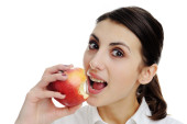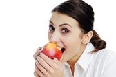 kobiece kobieta młody nastolatek jeść jabłko na śniadanie na białym tle