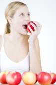 kobiece kobieta młody nastolatek jeść jabłko na śniadanie na białym tle