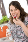 zdrowy styl życia serii - kobieta gospodarstwa miska truskawek na białym tle