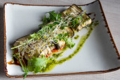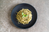 Miska pesto spaghetti z liśćmi bazylii i kiełkami fasoli