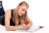Szczęśliwa kobieta nastolatek napisać pracę domową na białym tle