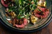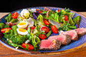 Sałatka ze średnio wysmażoną wołowiną, z pomidorami wiśniowymi w żółtej misce na białym marmurowym stole