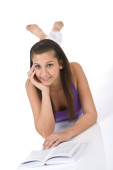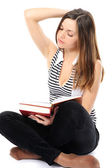 szczęśliwy chłopiec dama z książki leżącej na białym tle