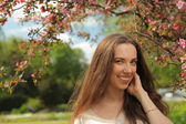 młoda kobieta korzystających wiosna pod drzewo kwiat
