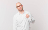 Zdjęcie "łysy mężczyzna wygląda bardzo zszokowany lub zaskoczony, patrząc z otwartymi ustami mówiąc wow" może być wykorzystywane do celów osobistych i komercyjnych zgodnie z warunkami zakupionej licencji Royalty-free. Obraz jest dostępny do pobrania w jakości wysokiej rozdzielczości do 5760x3840.