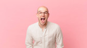łysy mężczyzna wygląda bardzo zszokowany lub zaskoczony, patrząc z otwartymi ustami mówiąc wow