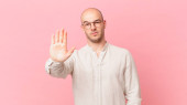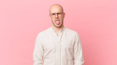 Zdjęcie "łysy mężczyzna czuje się szczęśliwy, zaskoczony i wesoły, uśmiecha się z pozytywnym nastawieniem, realizując rozwiązanie lub pomysł" może być wykorzystywane do celów osobistych i komercyjnych zgodnie z warunkami zakupionej licencji Royalty-free. Obraz jest dostępny do pobrania w jakości wysokiej rozdzielczości do 5760x3840.