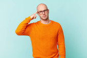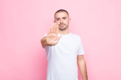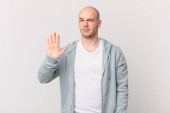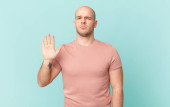 łysy mężczyzna wygląda poważnie, surowy, niezadowolony i zły pokazując otwartą dłoń co stop gest