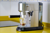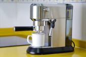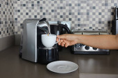 Kobieta trzyma nowoczesny ekspres do kawy z gejzerem nierdzewnej w kuchni na panelu indukcyjnym