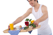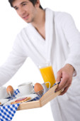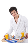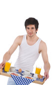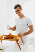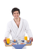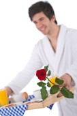 śniadanie - młody człowiek gospodarstwa taca z różą na białym tle, skupić się na kwiat
