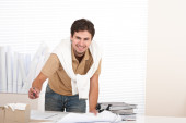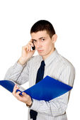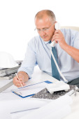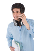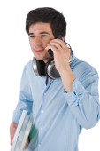 mężczyzna architekt studentów z hełmem i plany dzwonienie z telefonu komórkowego na białym tle