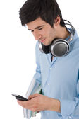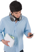 młody biznesmen relaks przy muzyce i laptopie siedząc na worek fasoli na białym tle