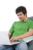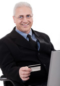 młody biznesmen z laptopa posiadania karty kredytowej