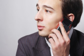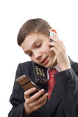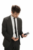 młody biznesmen posiadający telefon komórkowy, gazety i karty kredytowej na białym tle
