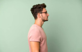 młody biznesmen na widoku profilu szuka kopiowania przestrzeni przed siebie, myśląc, wyobrażając sobie lub śniąc na jawie