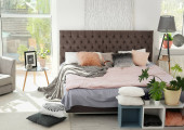 Nowoczesna sypialnia z pięknymi roślinami świeżego domu