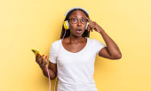 afro kobieta wygląda szczęśliwy, zdumiony i zaskoczony, uśmiechnięty i realizacji niesamowite i niesamowite dobre wieści. koncepcja muzyki