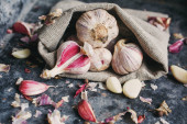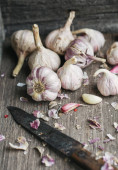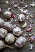 Czosnek. Ząbek czosnku i cebulka czosnku w zabytkowej osłonie. Cebulki czosnku na szarym tle. Koncepcja zdrowego stylu życia.