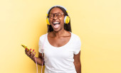 afro kobieta krzyczy z rękami w górze, czując wściekły, sfrustrowany, zestresowany i zdenerwowany. koncepcja muzyki