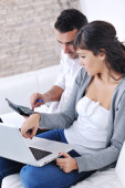 uczeń - dwóch nastolatek z laptopa w salonie, na zielony fotel
