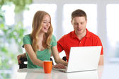 uczeń - dwóch nastolatek z laptopa w salonie, na zielony fotel