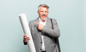 architekt czuje się dumny, beztroski, pewny siebie i szczęśliwy, uśmiechnięty pozytywnie z kciukami w górze