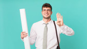 architekt uśmiecha się i wygląda przyjaźnie, pokazuje numer pięć lub pięć z ręką do przodu, odliczając w dół