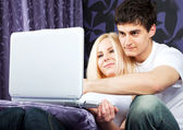 uczeń - dwóch nastolatek z laptopa i słuchawki