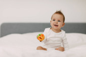 Mały chłopiec siedzi na stole kuchennym z bananem w rękach i uśmiecha się