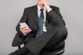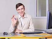 młody człowiek w biurze siedzi na krześle i rozmawia przez telefon