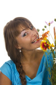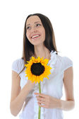 Ogrodnictwo - portret kobiety z słoneczniki na białym tle