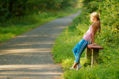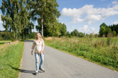 Jogging - sportowa kobieta biegająca po drodze w naturze, słuchająca muzyki ze słuchawkami