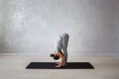 Widok boczny kobiety w odzieży sportowej stojącej w pozycji do jogi zginającej do przodu