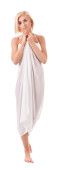 młode, piękne dziewczyny w ładny strój srebra z jej ręce z tyłu, patrząc w kamerę, siedząc na podłodze w studio na białym tle.