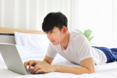 Zdjęcie "Młoda ładna Azjatka pracuje z domu na łóżku za pomocą laptopa komputerowego, aby uzyskać dostęp do jej pracy online z miejsca kopiowania" może być wykorzystywane do celów osobistych i komercyjnych zgodnie z warunkami zakupionej licencji Royalty-free. Obraz jest dostępny do pobrania w jakości wysokiej rozdzielczości do 5760x3840.