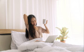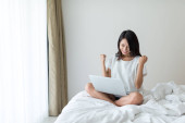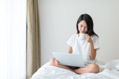 Młoda ładna Azjatka pracuje z domu na łóżku za pomocą laptopa komputerowego, aby uzyskać dostęp do jej pracy online z miejsca kopiowania